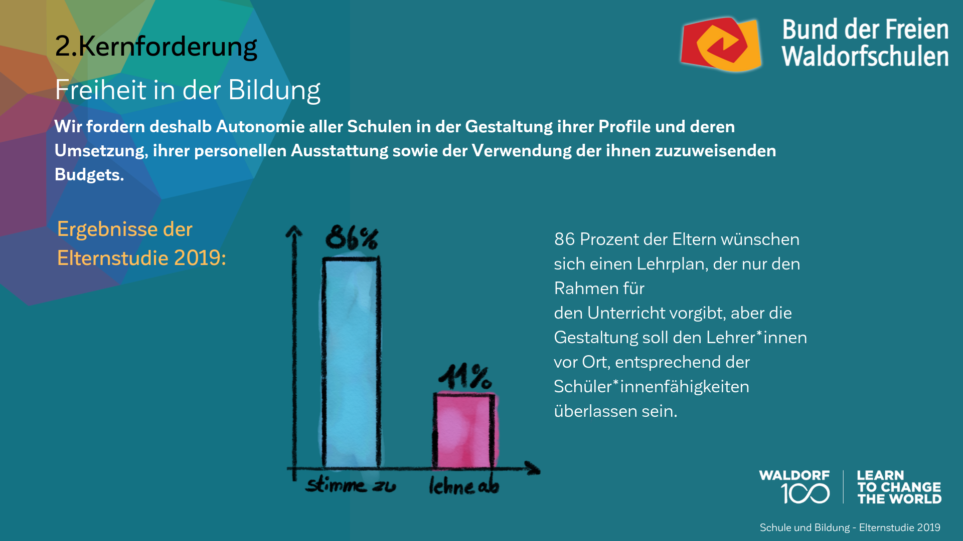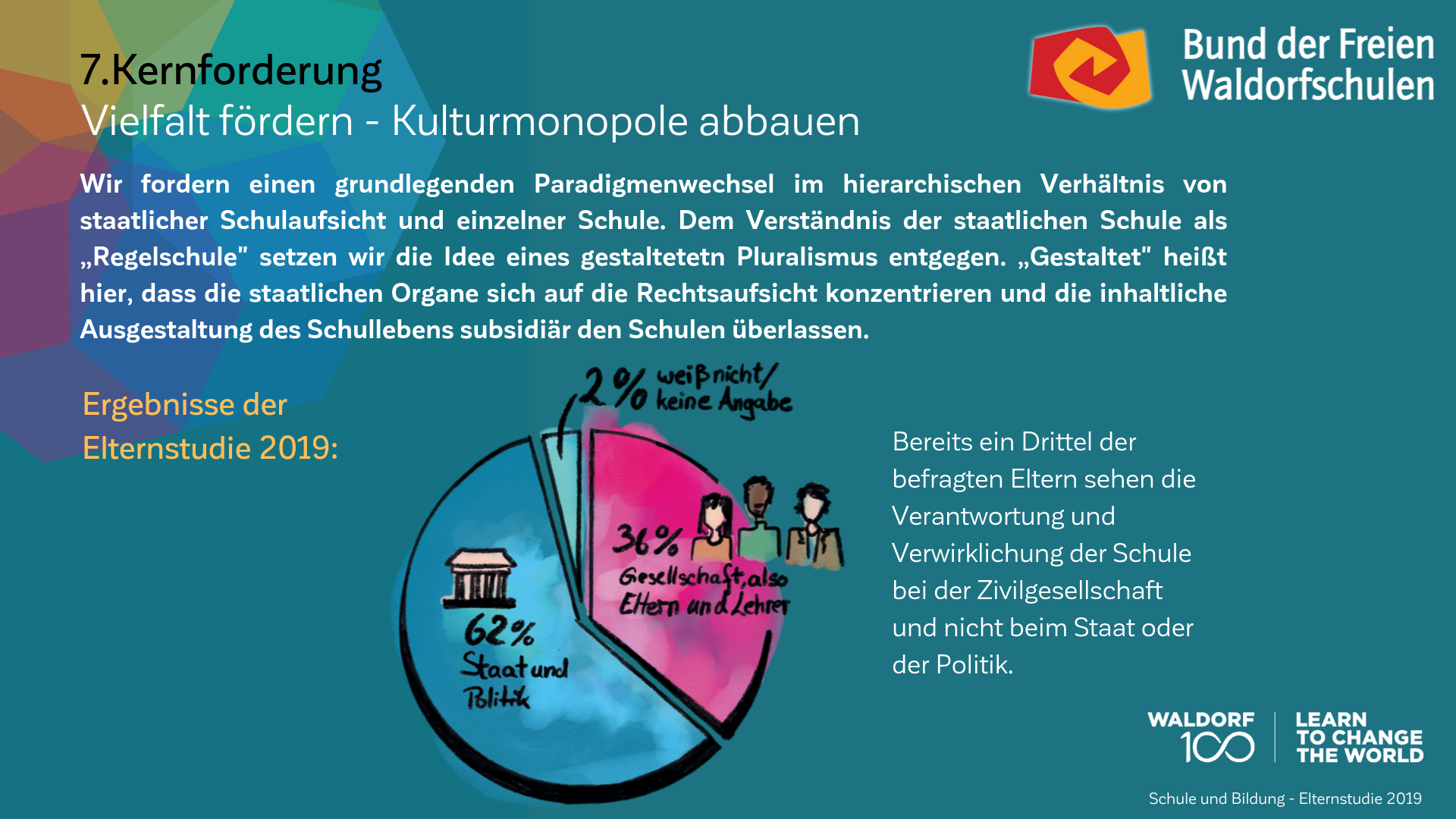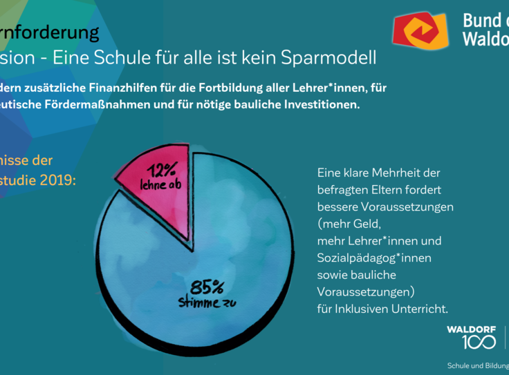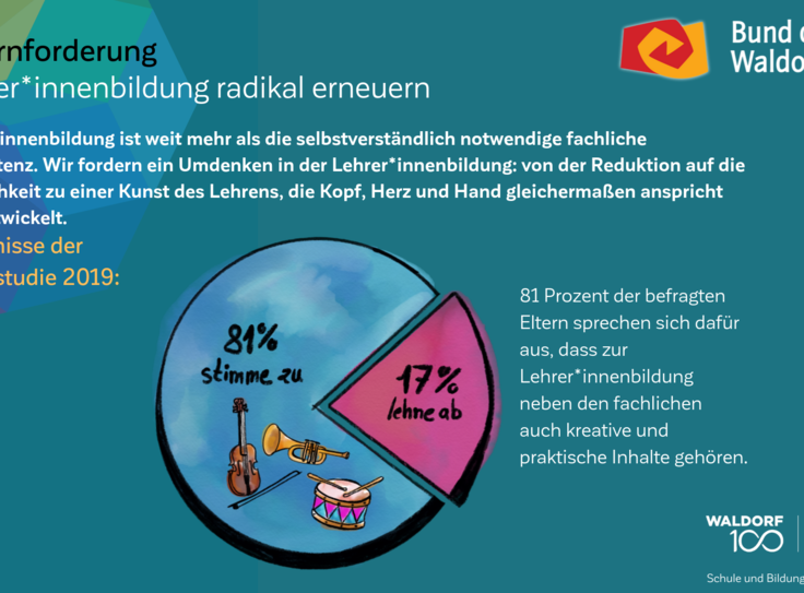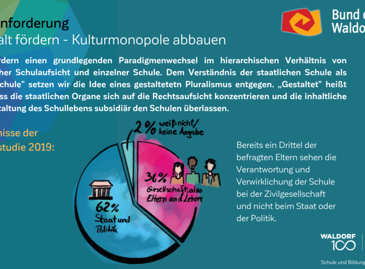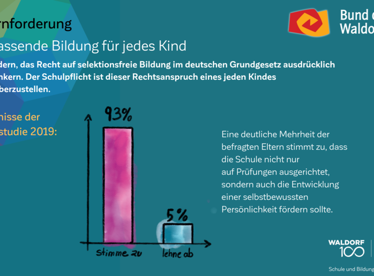 Auch am 100. Geburtstag der Waldorfpädagogik ist unser Blick in die Zukunft gerichtet. Wir setzen uns mit aller Kraft für ein zukunftsfähiges Schulwesen ein, das die Individualität der Schülerinnen und Schüler, die Professionalität der Lehrkräfte und die Mündigkeit der Eltern gleichermaßen ernst nimmt. Um dieses Ziel zu erreichen und die erforderlichen Debatten anzuregen, haben wir unsere Vision in „7 Kernforderungen an die Bildungspolitik“ zusammengefasst. Die Ergebnisse der Elternstudie 2019 zeigen eindrucksvoll, dass viele unserer Forderungen den Wünschen und Forderungen der deutschen Schuleltern an das System Schule mehrheitlich entsprechen.
