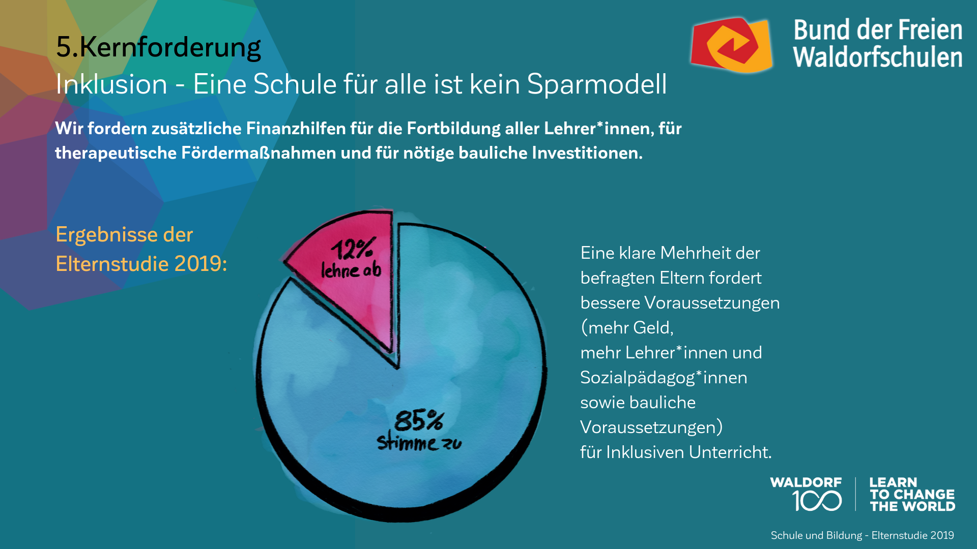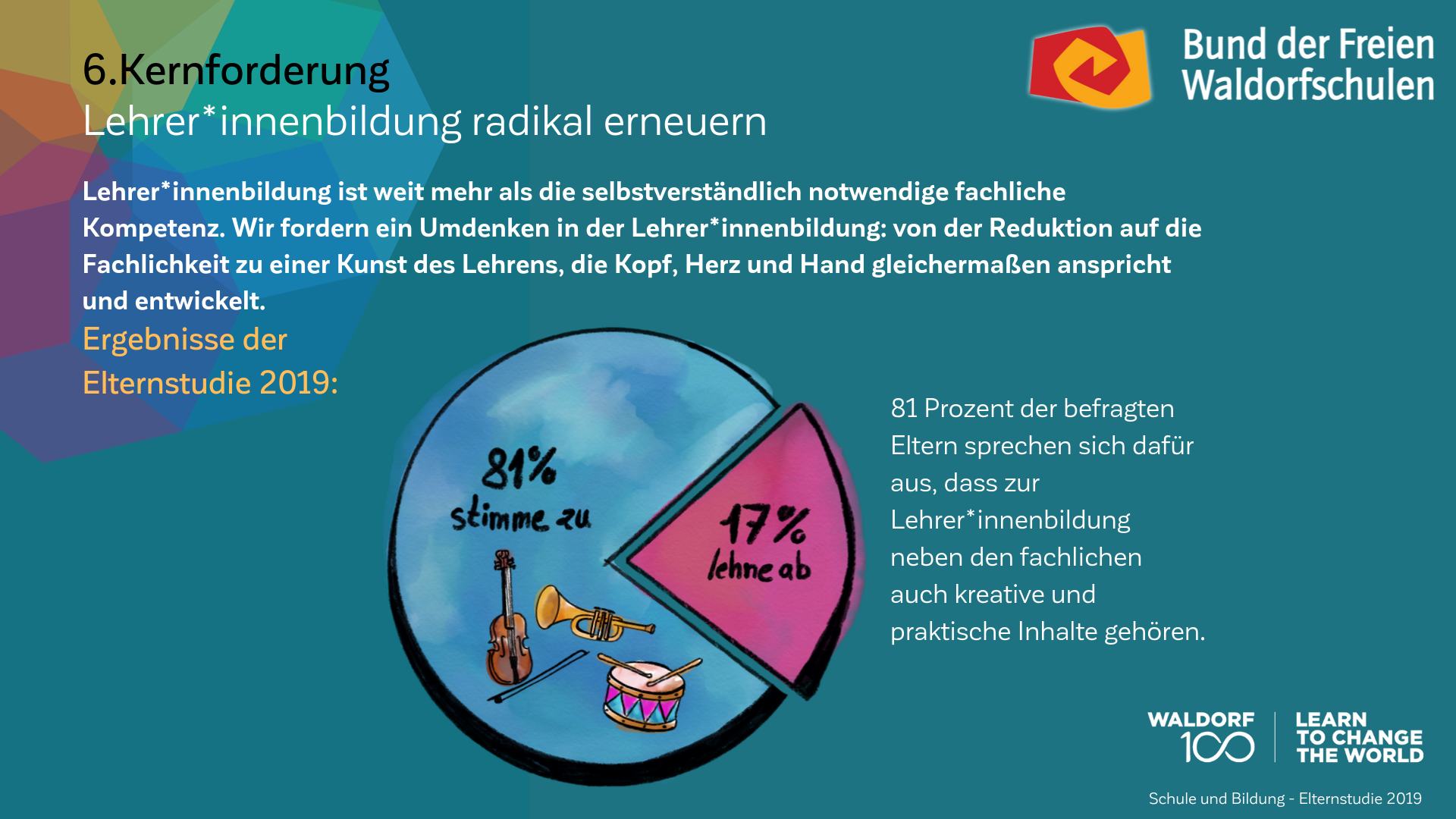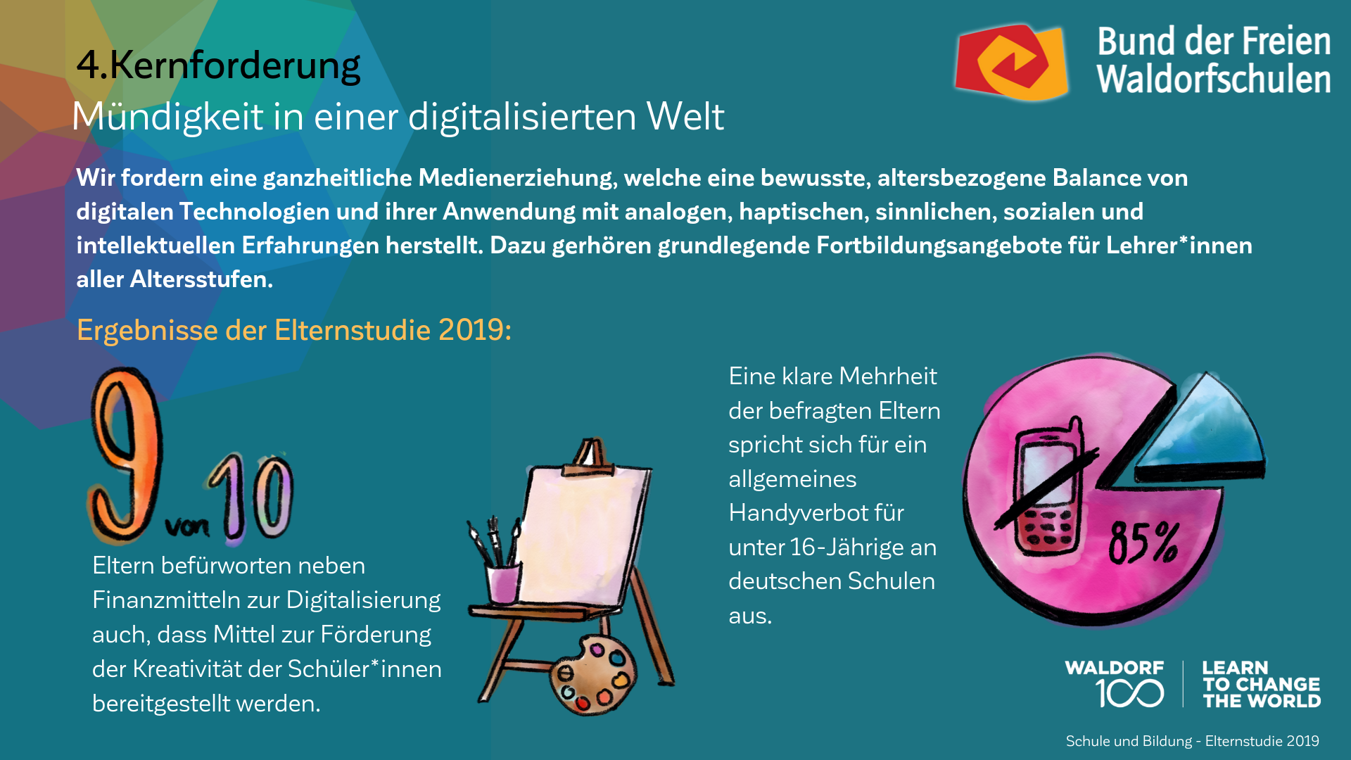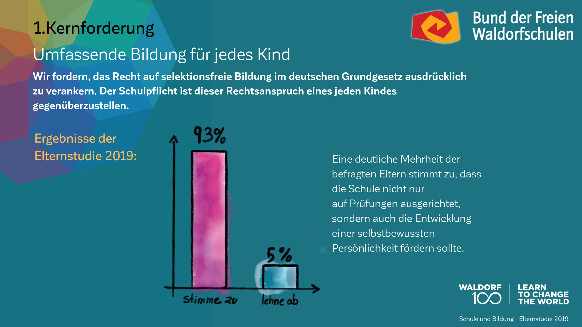 Auch am 100. Geburtstag der Waldorfpädagogik ist unser Blick in die Zukunft gerichtet. Wir setzen uns mit aller Kraft für ein zukunftsfähiges Schulwesen ein, das die Individualität der Schülerinnen und Schüler, die Professionalität der Lehrkräfte und die Mündigkeit der Eltern gleichermaßen ernst nimmt. Um dieses Ziel zu erreichen und die erforderlichen Debatten anzuregen, haben wir unsere Vision in „7 Kernforderungen an die Bildungspolitik“ zusammengefasst. Die Ergebnisse der Elternstudie 2019 zeigen eindrucksvoll, dass viele unserer Forderungen den Wünschen und Forderungen der deutschen Schuleltern an das System Schule mehrheitlich entsprechen.
